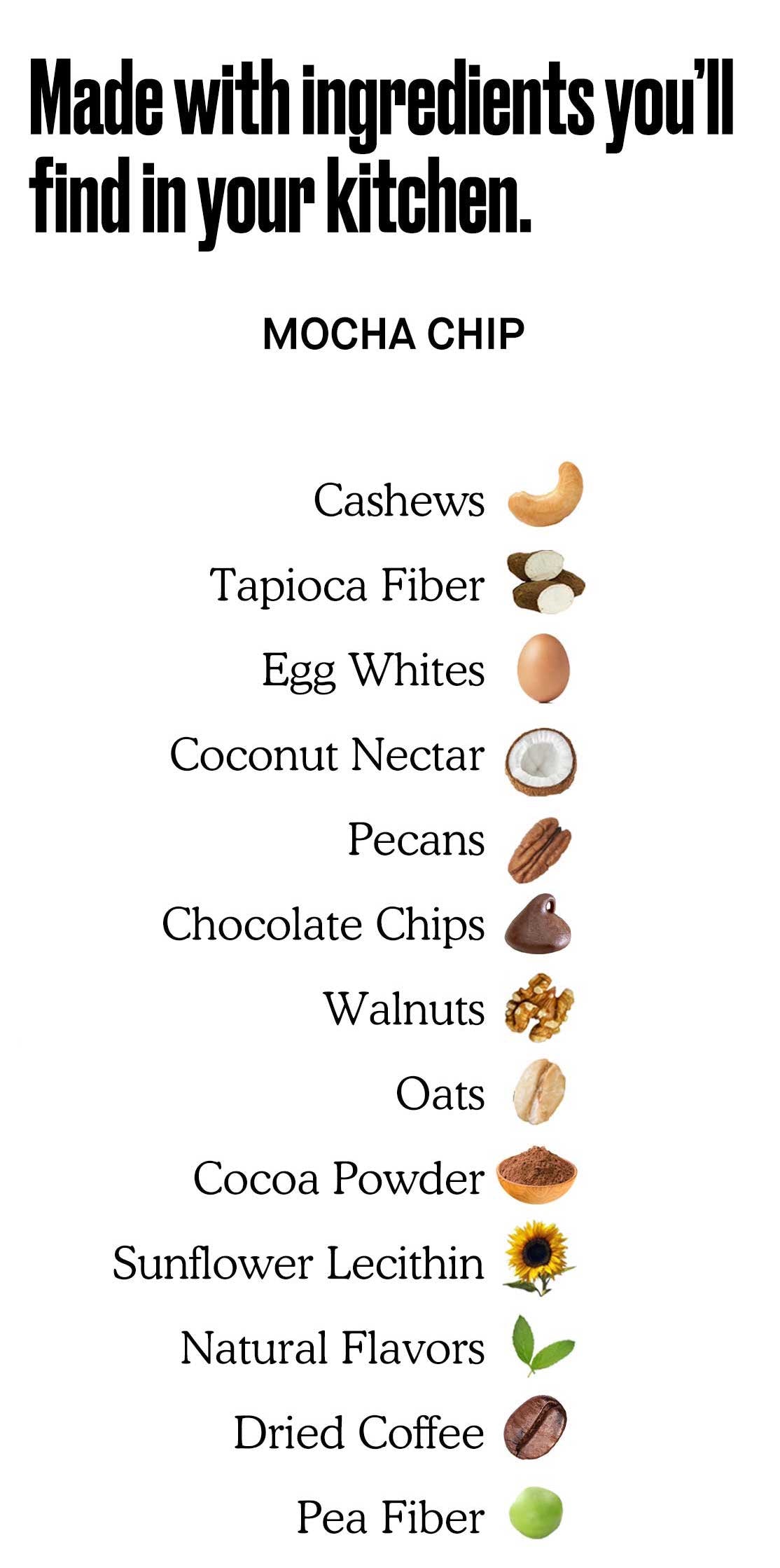 A carefully developed blend of natural ingredients is what makes it work. This includes protein from egg whites, prebiotic fiber from tapioca, naturally satiating cashews, low glycemic ingredients like coconut nectar and other foods that work together to help keep you feeling full & energized for longer.